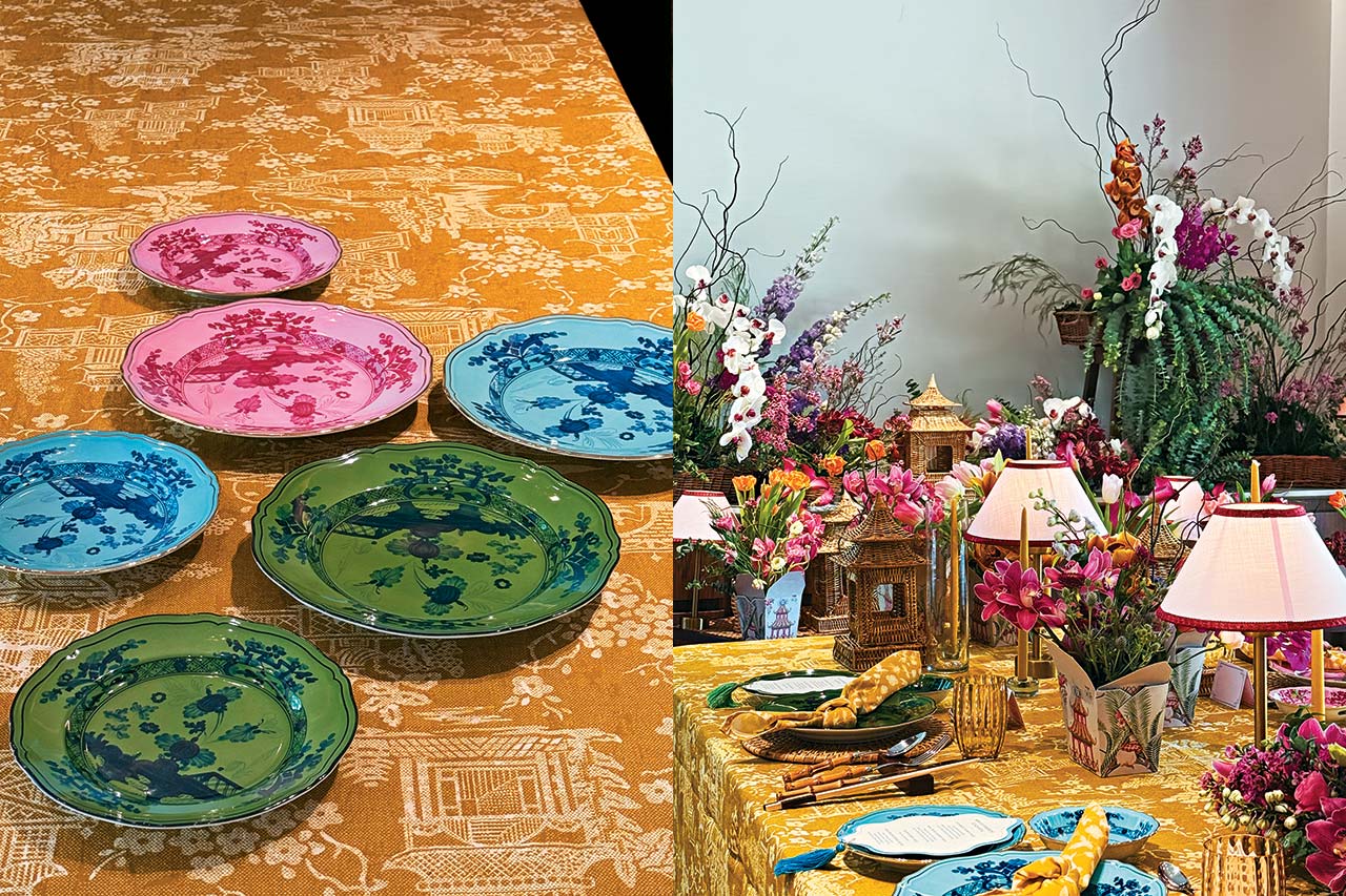 From there, we start layering thoughtfully. Ginori 1735’s Oriente Italiano collection followed naturally. Designed by Gio Ponti in the early 20th century, the collection is both historic and enduring. It is a bold homage to Italian craftsmanship, marrying the refined lines of the Antico Doccia tradition with the Garofano, a floral motif inspired by the mystique of oriental gardens. The palette is energetic yet controlled, and the decoration process allows colours to softly merge, turning each porcelain piece into a miniature canvas. It introduces vibrancy without overpowering the base.
